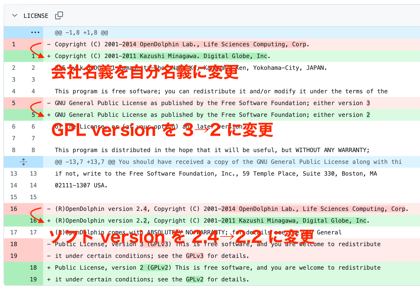 改竄された文書を正しいとみなしている時点で、主張の前提が崩れており、批判にもなっていないと思うのだが、改竄の事実に気がついていなくとも (C) 2001-2011 Kazushi Minagawa から (C) Kazushi Minagawa だけを取り出すのは不自然だ。文書全体を見れば (R) OpenDolphin version 2.2 とあるので、この LICENSE を version 2.7.0b のものとみなすのには無理があるからだ。