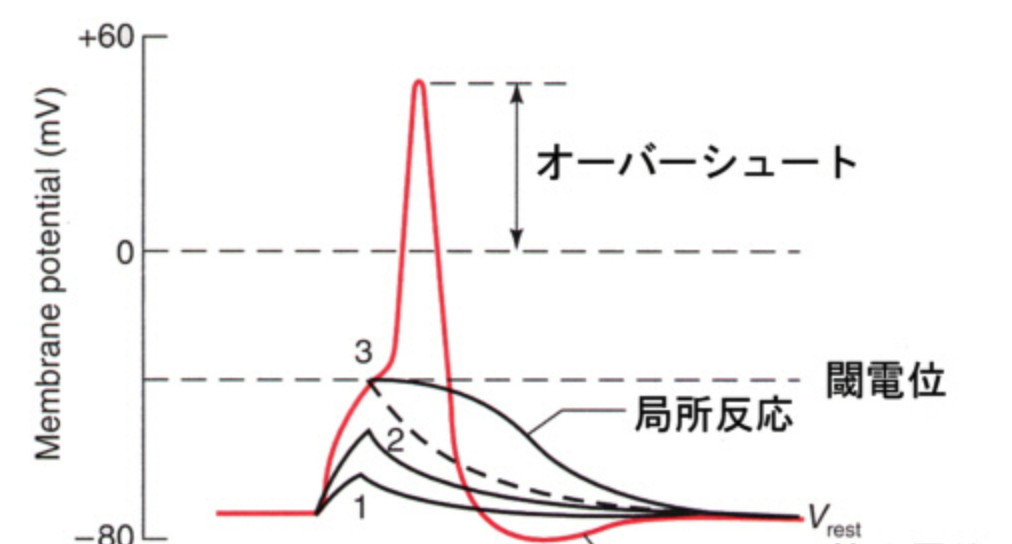 通常は神経細胞内部は負に帯電しているのだが、適当な刺激があると膜外に存在している陽イオン(大半は Na+)が膜内に流入する。説明は略すが、このとき膜内の電位は 0 [V] を振り切って数十 [mV] になることが知られている。あたかも「行き過ぎて」しまったかのように見えるのでオーバーシュートという言い方をよくする。